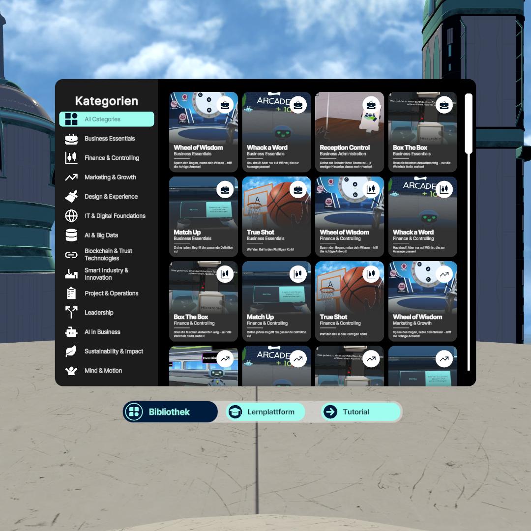 Die Teilnehmenden erhalten ein VR-Headset, starten ohne login los und erleben interaktive Lernwelten mit Minispielen, Tutorials und einer eigenen Lobby. Sie entscheiden selbst, welche Themen, Spiele oder Lerninhalte sie bearbeiten – flexibel, motivierend und ohne feste Reihenfolge. Verbindet man sein Gerät mit dem Internet, erhält man kostenlose Updates.