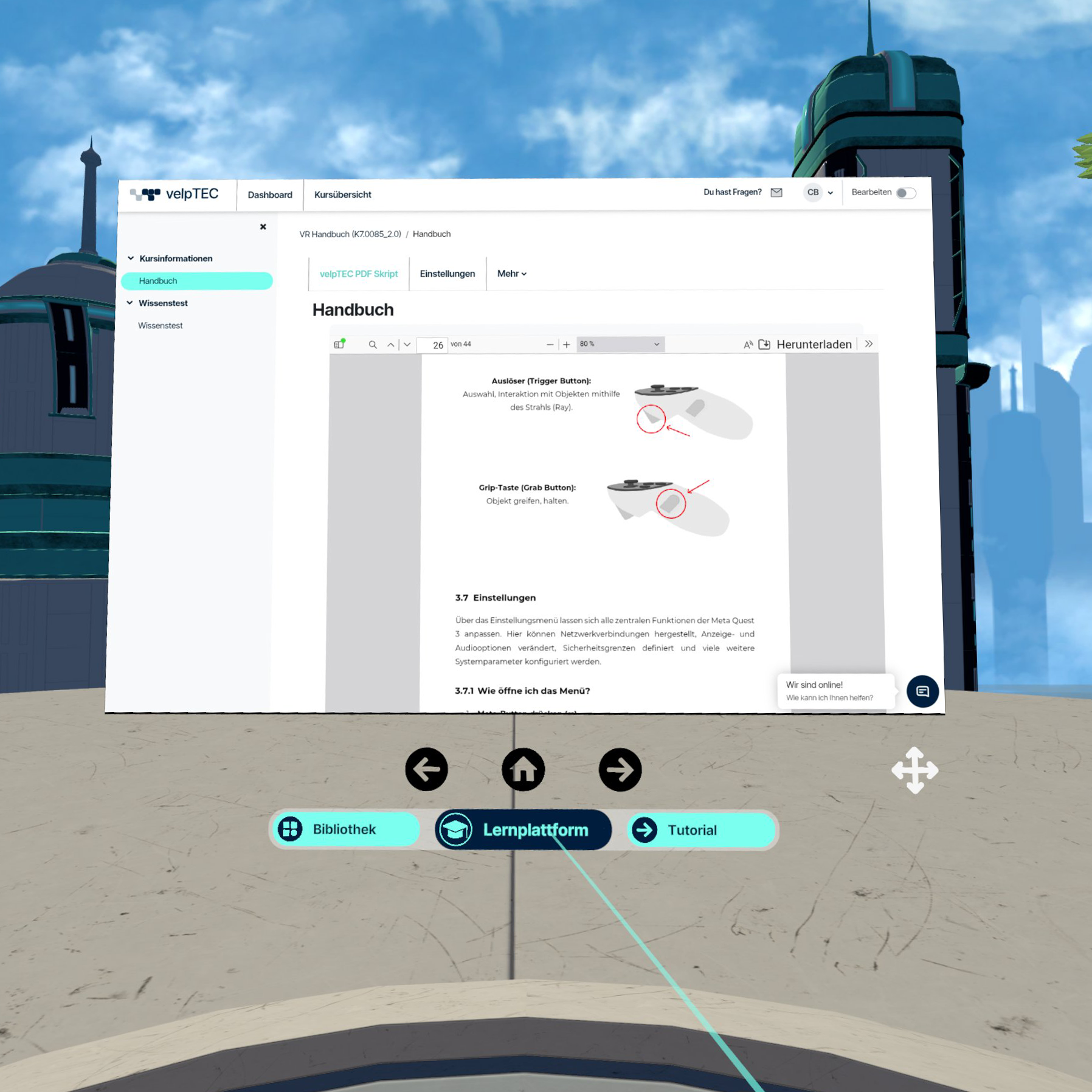 Unser VR-Produkt ermöglicht ein völlig neues Lernerlebnis. Statt passivem Konsum tauchen Teilnehmende aktiv in virtuelleLernwelten ein – mit Minispielen, interaktiven Aufgaben und praxisnahen Szenarien. Komplexe Inhalte werden spürbar und verständlich, während gleichzeitig digitale Kompetenzen im Umgang mit VR-Technologie aufgebaut werden.